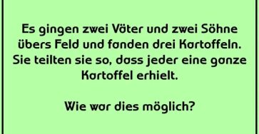 Zwei Väter und zwei Söhne teilen sich drei Kartoffeln – und trotzdem bekommt jeder eine. Klingt unmöglich? Dieses klassische Logikrätsel…